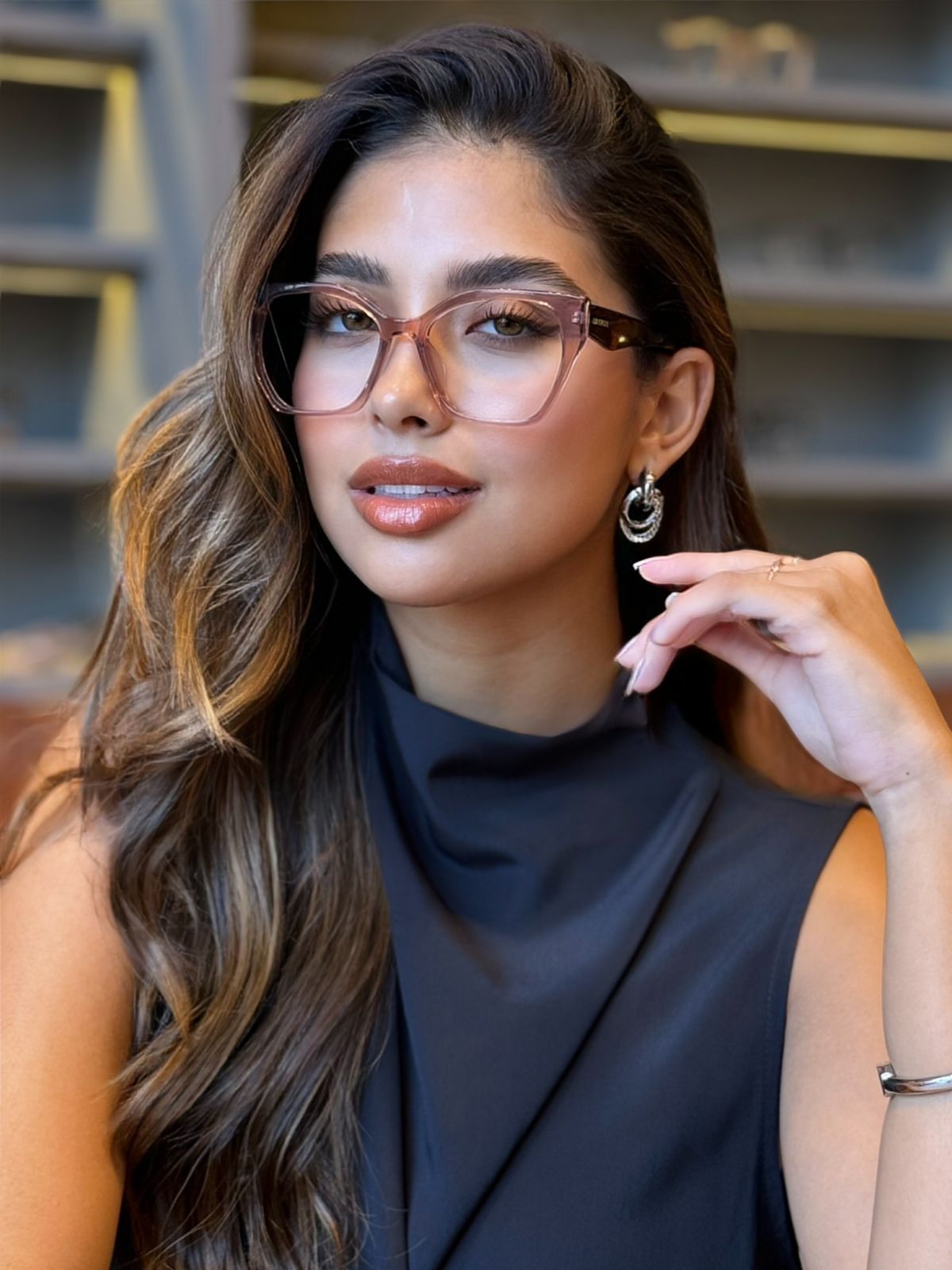 Armação em acetato rosé translúcido, delicada e sofisticada, que ilumina o olhar com um toque moderno. O formato levemente quadrado valoriza diferentes formatos de rosto, enquanto as hastes em demi trazem um contraste elegante e atemporal.